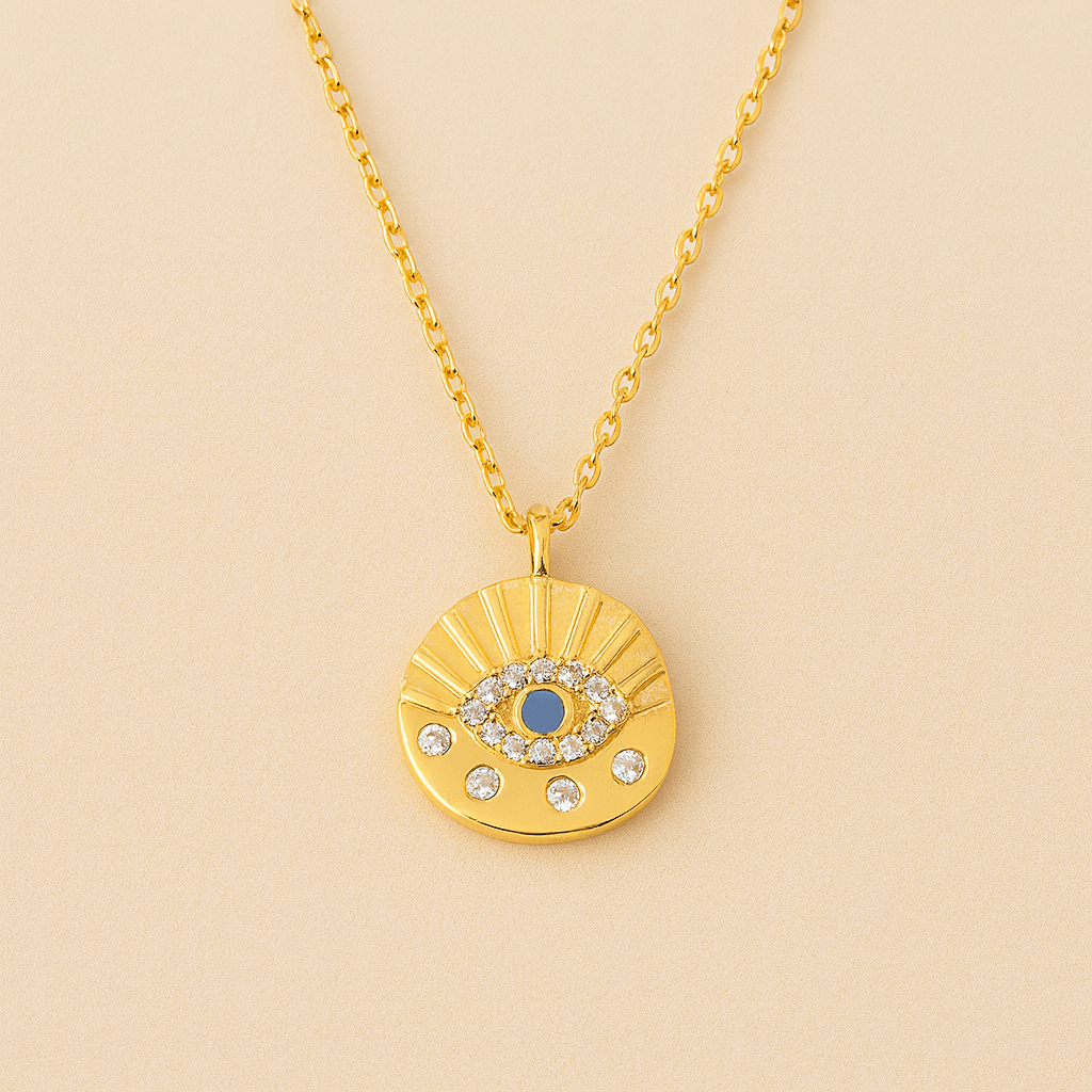 Este delicado collar está diseñado para acompañarte cada día con estilo y buena energía. Su colgante presenta un diseño de ojo protector central, rodeado de circonitas brillantes que aportan un toque de luz y sofisticación. Este collar es mucho más que una joya: es un símbolo de protección, intuición y luz interior. Perfecto para combinar con otros collares o llevar como protagonista de tus looks.