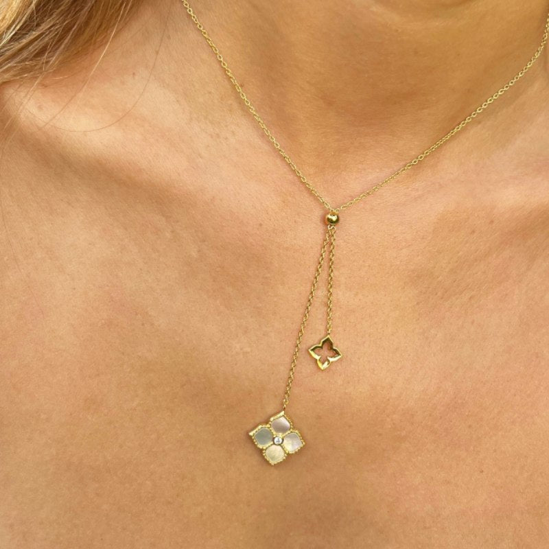 Collar de plata tipo "Y" con dije en forma de flor de cuatro pétalos con incrustaciones de nácar. Diseño que combina sencillez y sofisticación, lo que lo hace ideal tanto para uso diario como para ocasiones especiales.