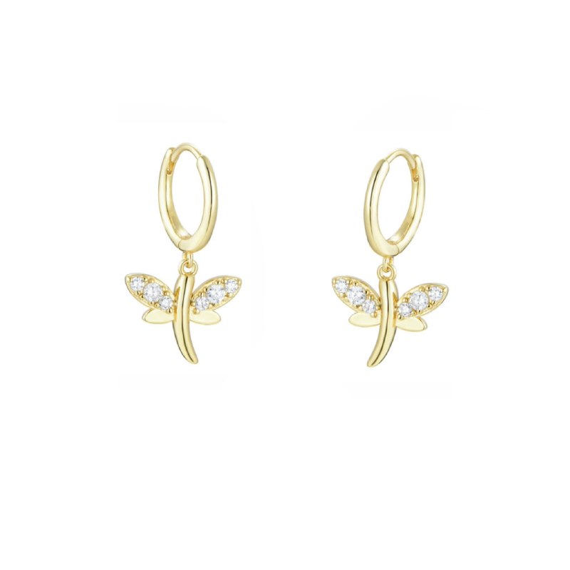 Delicados aros en plata de ley bañada en oro que presentan un charm en forma de libélula, símbolo de transformación y libertad. Sus alas están adornadas con circonitas blancas que aportan un destello luminoso y refinado, perfecto para realzar tu estilo con un toque natural y sofisticado.