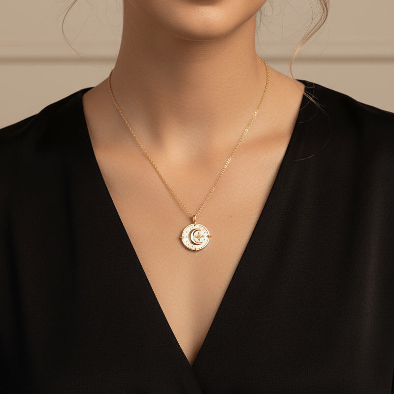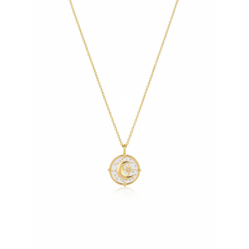 This delicate necklace is crafted from gold-plated 925 sterling silver and features a circular pendant with white enamel detailing. Its celestial design combines an elegant crescent moon and a central star, creating a piece full of symbolism and charm. Perfect for everyday wear or to add a mystical and sophisticated touch to any look.