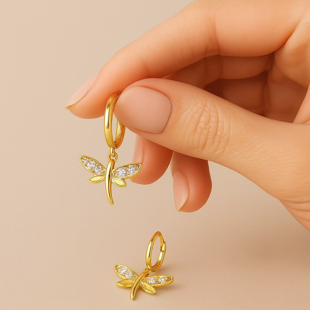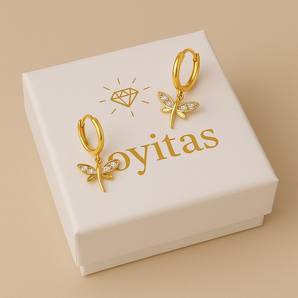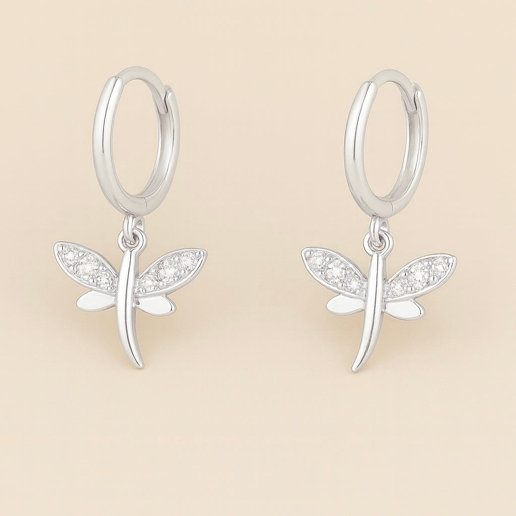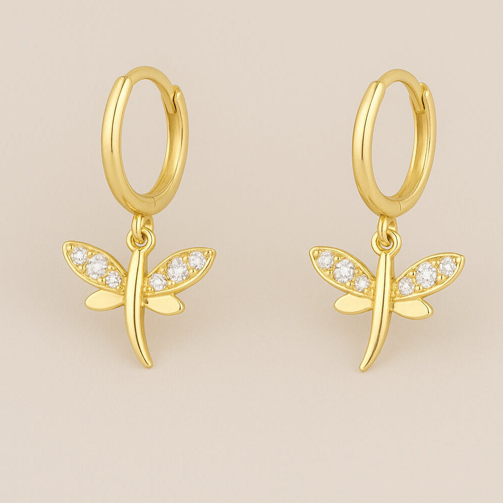 Delicados aros en plata de ley bañada en oro que presentan un charm en forma de libélula, símbolo de transformación y libertad. Sus alas están adornadas con circonitas blancas que aportan un destello luminoso y refinado, perfecto para realzar tu estilo con un toque natural y sofisticado.